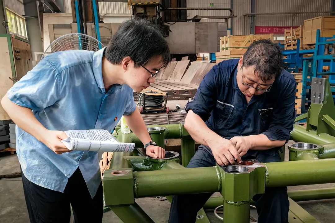 暑氣蒸騰,車間如爐。萬(wàn)山公司車間里,年輕的技術(shù)員俯身與操作者在操作現(xiàn)場(chǎng)共商方案,滾落的汗珠浸透工裝,勾勒出他們專注的身影。(圖文/王小芳 劉澤華)