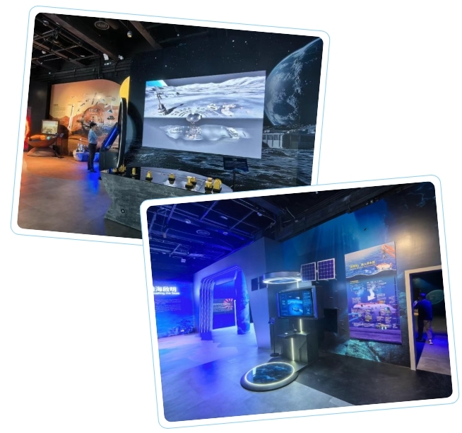 除了嫦娥六號(hào)采集的月壤等一系列國(guó)寶級(jí)展品的展出以外,本次展覽還有一大亮點(diǎn):項(xiàng)目團(tuán)隊(duì)充分發(fā)揮多媒體集成與軟件開發(fā)優(yōu)勢(shì),創(chuàng)造性地打造了“三航”CAVE沉浸式空間、虛擬現(xiàn)實(shí)的“月球基地”、“我的火星生活”“我的祝融號(hào)”“我的太陽系”、空間站體驗(yàn)、“海天對(duì)話”等多個(gè)自主研發(fā)的展項(xiàng)。其中,迭代升級(jí)后的“海天對(duì)話”在語音識(shí)別能力上有了大幅提升,視頻、音頻、文字等多種內(nèi)容載體的結(jié)合也使得展項(xiàng)交互變得更加豐富。