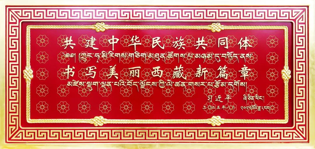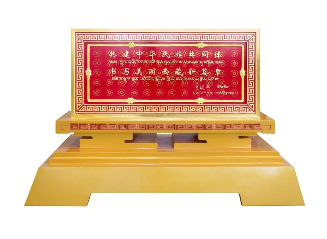 賀匾正面為習(xí)近平總書記題詞,背面展現(xiàn)西藏自治區(qū)成立60周年經(jīng)濟(jì)社會(huì)發(fā)展成就。整體造型端莊大氣,以鮮艷的中國(guó)紅為底色,采用格?;y、長(zhǎng)城紋、繩結(jié)紋等獨(dú)具匠心的特色設(shè)計(jì),象征民族團(tuán)結(jié)、共同繁榮,寓意各民族共同熔鑄為中華民族共同體。
