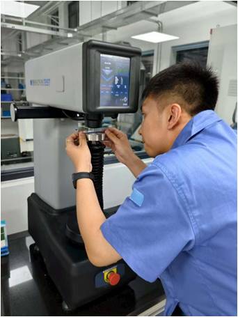 位于701庫的性能組實(shí)驗(yàn)室里燈火通明,試驗(yàn)機(jī)與洛氏硬度計(jì)發(fā)出持續(xù)不斷的規(guī)律蜂鳴。性能組組長黃姐和組員小王被堆積如山的待檢樣品包圍。每一份樣品都需經(jīng)受嚴(yán)格考驗(yàn):電子萬能試驗(yàn)機(jī)上,金屬樣條被緩緩拉長直至斷裂,電腦屏幕實(shí)時(shí)繪制著反應(yīng)材料強(qiáng)度的拉伸曲線;洛氏硬度計(jì)旁,檢測員凝神屏息,在無數(shù)樣品表面精準(zhǔn)施壓,記錄著一個(gè)個(gè)硬度數(shù)據(jù)點(diǎn)。連續(xù)數(shù)小時(shí)高強(qiáng)度操作,手臂早已酸痛難當(dāng),目光卻依舊如炬,牢牢鎖定每一個(gè)讀數(shù)、每一個(gè)數(shù)據(jù)點(diǎn)。